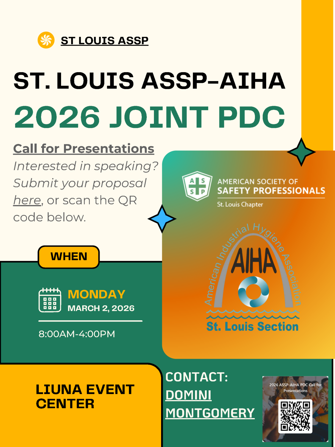 2026 Joint PDC – ASSP & AIHA 2026 Joint PDC March 2, 2026 8:00 am - 4:00 pm 2026 PDC Call for Presenters Tickets Price Qty Limited Student Registrationshow details +hide details - $0.00 USD Quantity 0 1 2 3 Details Available on a first come basis for full time EH&S students. Sale Dates - The dates when this option is available for purchase. Goes On Sale: January 12, 2026 11:15 am Sales End: March 1, 2026 12:00 am Access - This option allows access to the following dates and times. Date Time Sold Remaining TotalSold Total SpacesLeft 2026 Joint PDC March 2, 2026 8:00 am to 4:00 pm 2 3 35 unlimited Attendee (Early Bird)show details +hide details - $150.00 USD Quantity 0 1 2 3 4 5 6 7 8 9 10 Details Price Name Description Amount Attendee (Early Bird) $150.00 USD Total $150.00 USD Sale Dates - The dates when this option is available for purchase. Goes On Sale: January 12, 2026 7:50 am Sales End: January 31, 2026 11:55 pm Access - This option allows access to the following dates and times. Date Time Sold Remaining TotalSold Total SpacesLeft 2026 Joint PDC March 2, 2026 8:00 am to 4:00 pm 21 79 35 unlimited Attendee (Regular Rate)show details +hide details - $200.00 USD Goes On SaleFebruary 1, 2026 Details Price Name Description Amount Attendee (Regular Rate) $200.00 USD Total $200.00 USD Sale Dates - The dates when this option is available for purchase. Goes On Sale: February 1, 2026 10:30 am Sales End: March 1, 2026 12:00 am Access - This option allows access to the following dates and times. Date Time Sold Remaining TotalSold Total SpacesLeft 2026 Joint PDC March 2, 2026 8:00 am to 4:00 pm 0 unlimited 35 unlimited Partner/Vendorshow details +hide details - $300.00 USD Quantity 0 1 2 3 4 5 6 7 8 9 10 Details Price Name Description Amount Partner/Vendor $300.00 USD Total $300.00 USD Sale Dates - The dates when this option is available for purchase. Goes On Sale: January 12, 2026 7:50 am Sales End: March 1, 2026 12:00 am Access - This option allows access to the following dates and times. Date Time Sold Remaining TotalSold Total SpacesLeft 2026 Joint PDC March 2, 2026 8:00 am to 4:00 pm 6 unlimited 35 unlimited Bronze Sponsorshow details +hide details - $500.00 USD Quantity 0 1 2 3 4 5 6 7 8 9 10 Details Price Name Description Amount Bronze Sponsor $500.00 USD Total $500.00 USD Sale Dates - The dates when this option is available for purchase. Goes On Sale: January 12, 2026 7:50 am Sales End: March 1, 2026 12:00 am Access - This option allows access to the following dates and times. Date Time Sold Remaining TotalSold Total SpacesLeft 2026 Joint PDC March 2, 2026 8:00 am to 4:00 pm 3 unlimited 35 unlimited Silver Sponsorshow details +hide details - $1,000.00 USD Quantity 0 1 2 3 4 5 6 7 8 9 10 Details Price Name Description Amount Silver Sponsor $1,000.00 USD Total $1,000.00 USD Sale Dates - The dates when this option is available for purchase. Goes On Sale: January 12, 2026 7:50 am Sales End: March 1, 2026 12:00 am Access - This option allows access to the following dates and times. Date Time Sold Remaining TotalSold Total SpacesLeft 2026 Joint PDC March 2, 2026 8:00 am to 4:00 pm 2 unlimited 35 unlimited Gold Sponsorshow details +hide details - $1,500.00 USD Quantity 0 1 2 3 4 5 6 7 8 9 10 Details Price Name Description Amount Gold Sponsor $1,500.00 USD Total $1,500.00 USD Sale Dates - The dates when this option is available for purchase. Goes On Sale: January 12, 2026 7:50 am Sales End: March 1, 2026 12:00 am Access - This option allows access to the following dates and times. Date Time Sold Remaining TotalSold Total SpacesLeft 2026 Joint PDC March 2, 2026 8:00 am to 4:00 pm 0 unlimited 35 unlimited Platinum Sponsorshow details +hide details - $2,000.00 USD Quantity 0 1 2 3 4 5 6 7 8 9 10 Details Price Name Description Amount Platinum Sponsor $2,000.00 USD Total $2,000.00 USD Sale Dates - The dates when this option is available for purchase. Goes On Sale: January 12, 2026 7:50 am Sales End: March 1, 2026 12:00 am Access - This option allows access to the following dates and times. Date Time Sold Remaining TotalSold Total SpacesLeft 2026 Joint PDC March 2, 2026 8:00 am to 4:00 pm 1 unlimited 35 unlimited Sponsor Other Amount or Pay by Checkshow details +hide details - $0.00 USD Quantity 0 1 2 3 4 5 6 7 8 9 10 Details Sale Dates - The dates when this option is available for purchase. Goes On Sale: January 12, 2026 7:50 am Sales End: March 1, 2026 12:00 am Access - This option allows access to the following dates and times. Date Time Sold Remaining TotalSold Total SpacesLeft 2026 Joint PDC March 2, 2026 8:00 am to 4:00 pm 0 unlimited 35 unlimited please do not enter anything in this input Venue: LIUNA Event Center Address: 4532 South Lindbergh Blvd, St. Louis, Missouri, 63127, United States